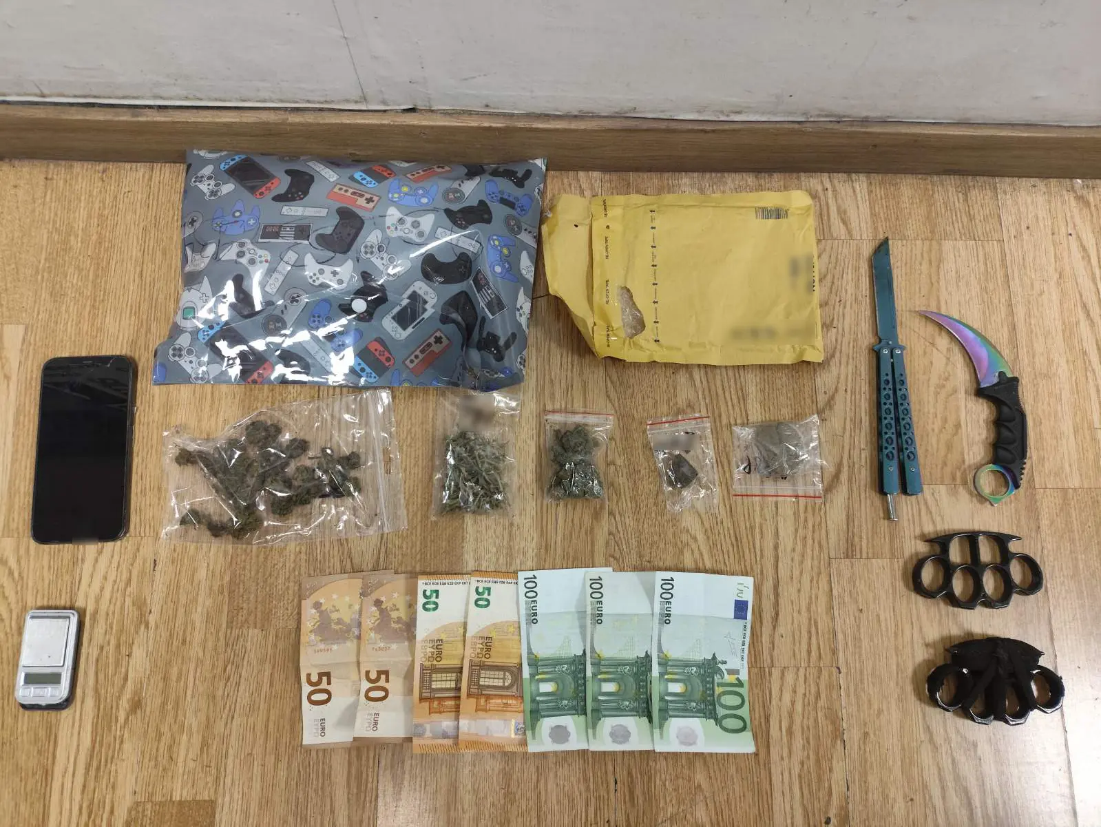 Κατά την έρευνα που ακολούθησε στην κατοχή του και στην οικία του, οι αστυνομικοί βρήκαν συνολικά 89,3 γραμμάρια ακατέργαστης κάνναβης και 9,9 γραμμάρια κατεργασμένης. Η υπόθεση αποκτά πρόσθετη σοβαρότητα λόγω του οπλισμού που βρέθηκε, ο οποίος περιλάμβανε δύο μαχαίρια (τύπου πεταλούδα και karambit) και δύο σιδερογροθιές.