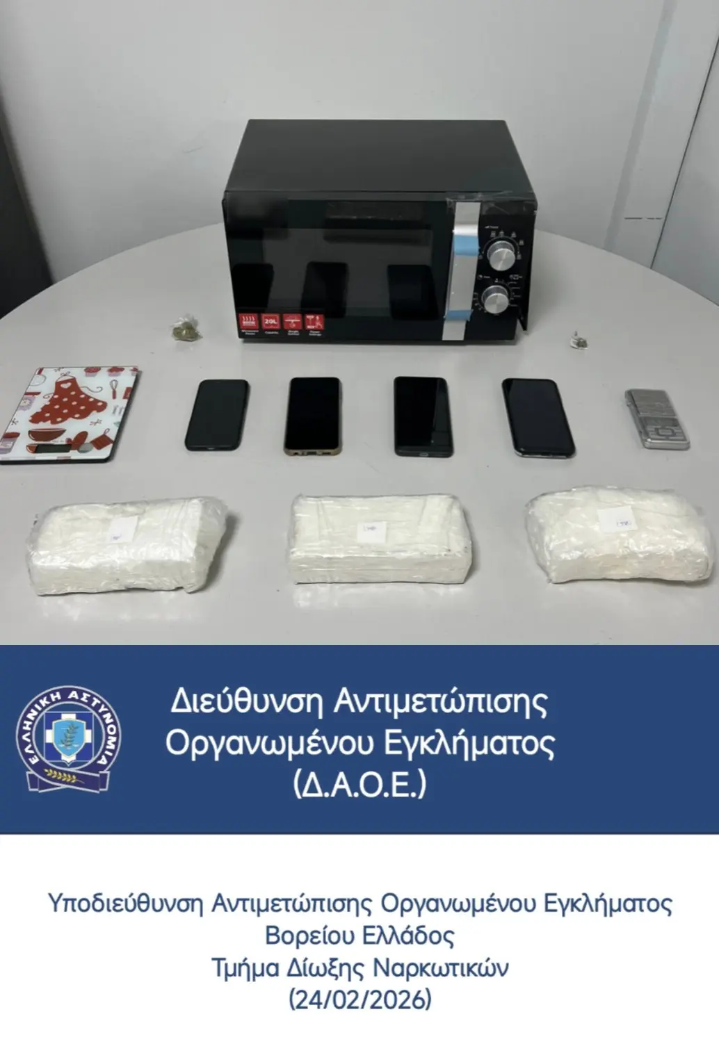 Κατά την έρευνα, οι αστυνομικοί εντόπισαν έναν φούρνο μικροκυμάτων ο οποίος είχε μετατραπεί σε κρύπτη. Στο εσωτερικό του βρέθηκαν τρεις συσκευασίες με 2.927 γραμμάρια κοκαΐνης, μια ποσότητα που υποδηλώνει τη μεγάλη οικονομική ισχύ της συγκεκριμένης οργάνωσης.