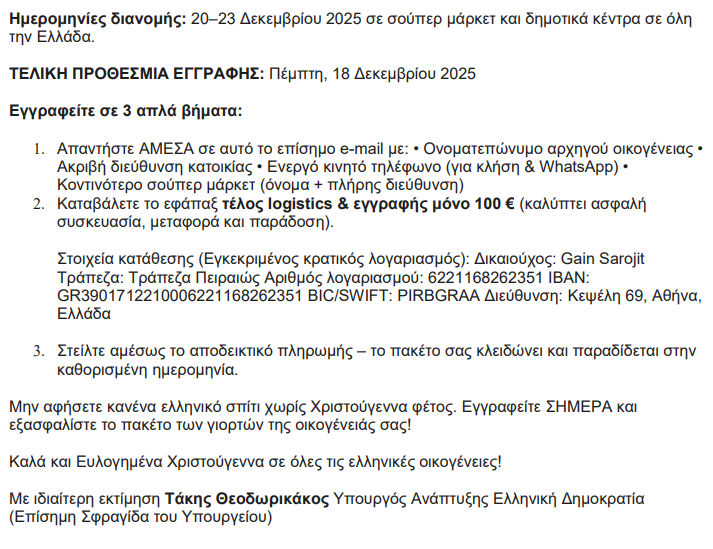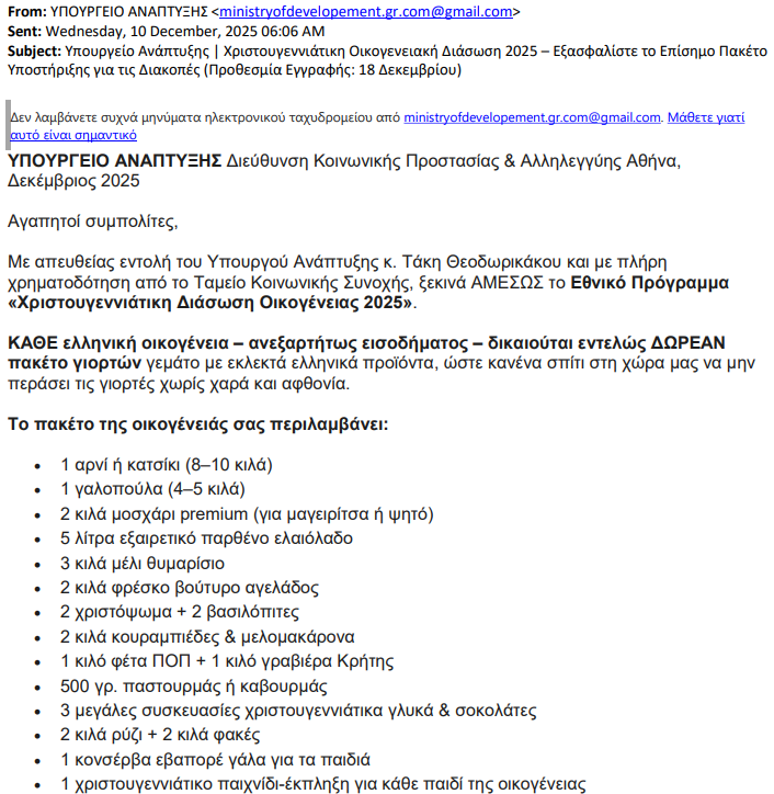 Όπως ανακοίνωσε η Δελτίο Τύπου Ελληνικής Αστυνομίας, ένα παραπλανητικό e-mail κυκλοφορεί ευρέως, προσποιούμενο ότι προέρχεται από το Υπουργείο Ανάπτυξης. Το μήνυμα υπόσχεται ένα «δωρεάν γιορτινό πακέτο» στο πλαίσιο της δήθεν «Χριστουγεννιάτικης Διάσωσης Οικογένειας 2025». Για να προσδώσουν αληθοφάνεια, οι επιτήδειοι χρησιμοποιούν τα στοιχεία του Υπουργού Ανάπτυξης, Τάκη Θεοδωρικάκου, ισχυριζόμενοι ότι η πρωτοβουλία αποτελεί «απευθείας εντολή του». Έχουν μάλιστα δημιουργήσει και ψεύτικη διεύθυνση ηλεκτρονικού ταχυδρομείου που παραπέμπει στο Υπουργείο.