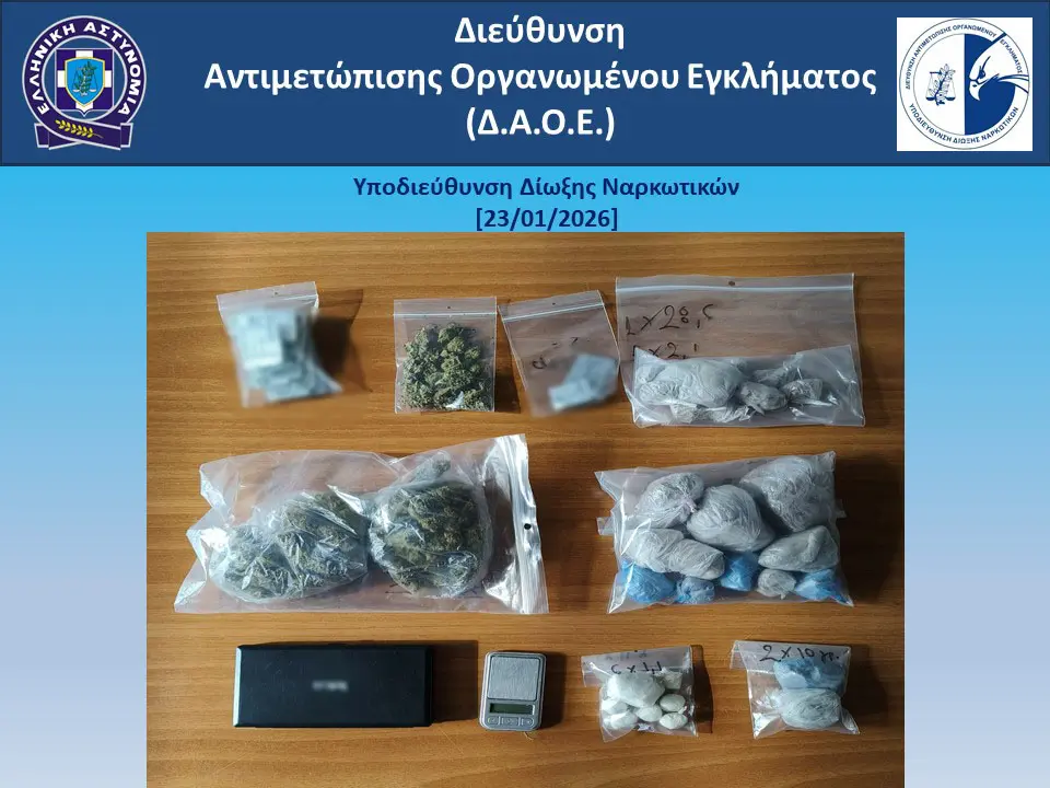 Κατά τη διάρκεια των ερευνών κατασχέθηκαν σημαντικές ποσότητες, μεταξύ των οποίων 280 γραμμάρια ηρωίνης και 18 γραμμάρια κοκαΐνης. Επιπλέον, βρέθηκαν 51,5 γραμμάρια ακατέργαστης κάνναβης, 36 φαρμακευτικά δισκία, καθώς και δύο ηλεκτρονικές ζυγαριές ακριβείας που χρησιμοποιούνταν για τον μερισμό των δόσεων.