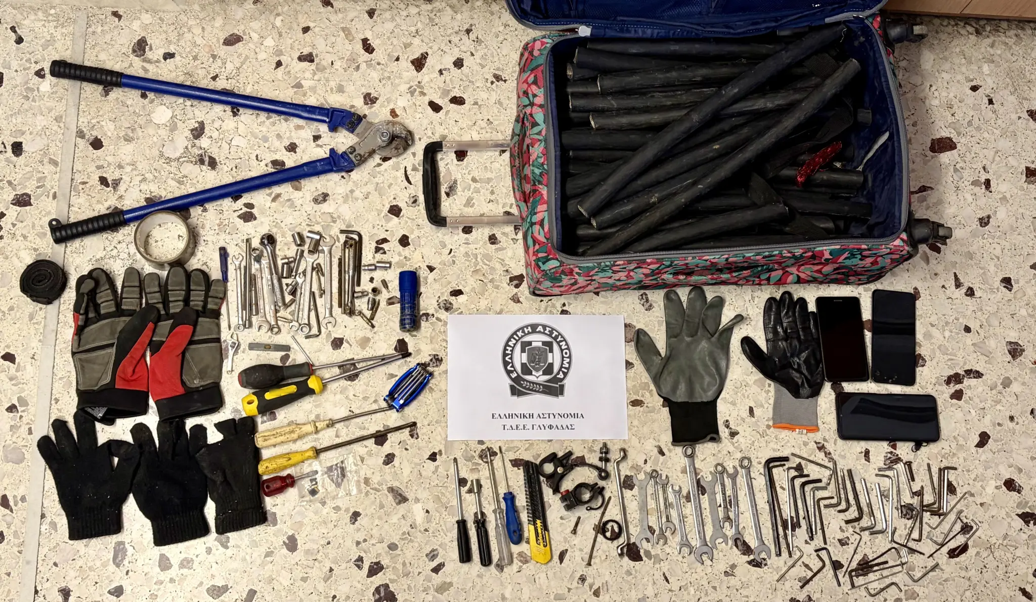 Κατά τον έλεγχο που πραγματοποιήθηκε στην κατοχή τους, βρέθηκαν και κατασχέθηκαν διάφορα διαρρηκτικά εργαλεία, ένας φακός και δύο ζευγάρια γάντια. Τα ευρήματα αυτά ενισχύουν την κατηγορία της διακεκριμένης κλοπής κατά συναυτουργία, καθώς υποδηλώνουν προσχεδιασμένη ενέργεια. Η δικογραφία που σχηματίστηκε σε βάρος τους θα οδηγηθεί στον αρμόδιο Εισαγγελέα.