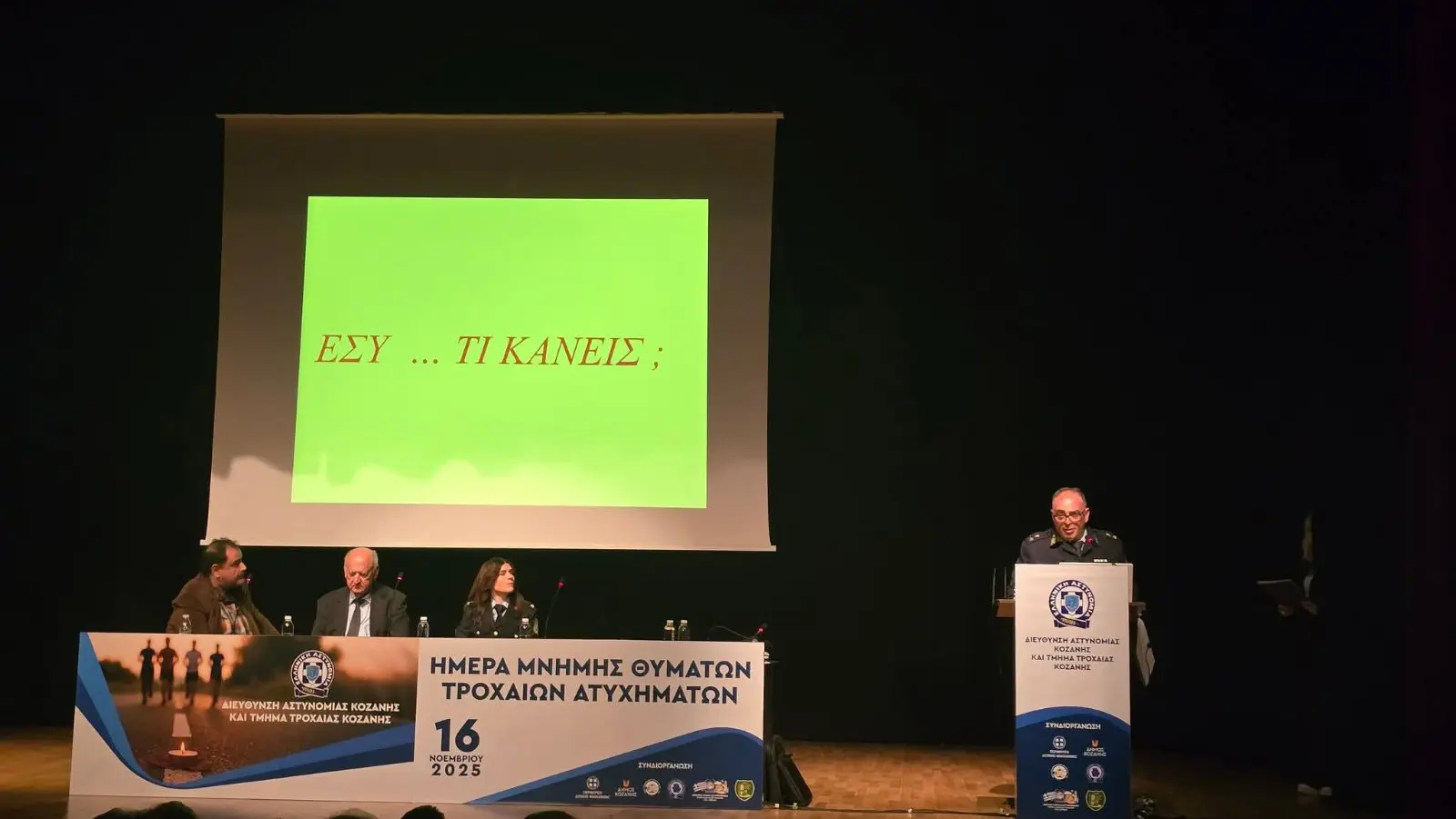 Ιδιαίτερα συγκινητικές ήταν οι βιωματικές εμπειρίες πολιτών που υπήρξαν θύματα τροχαίων ατυχημάτων, καθώς και συγγενών τους, οι οποίες καθήλωσαν το κοινό με τις περιγραφές τους. Την έναρξη της εκδήλωσης τίμησαν με χαιρετισμούς ο Γενικός Περιφερειακός Αστυνομικός Διευθυντής Δυτικής Μακεδονίας, Ταξίαρχος κ. Κωνσταντίνος Σπανούδης, ο Περιφερειάρχης Δυτικής Μακεδονίας, κ. Γέωργιος Αμανατίδης, ο Βουλευτής της Π.Ε. Κοζάνης, κ. Μιχαήλ Παπαδόπουλος, η Διοικήτρια του Γενικού Νοσοκομείου Κοζάνης, κα. Ευτυχία Καπάτου και ο Διευθυντής της Διεύθυνσης Αστυνομίας Κοζάνης, Αστυνομικός Διευθυντής κ. Ηλίας Τσιότσιας.