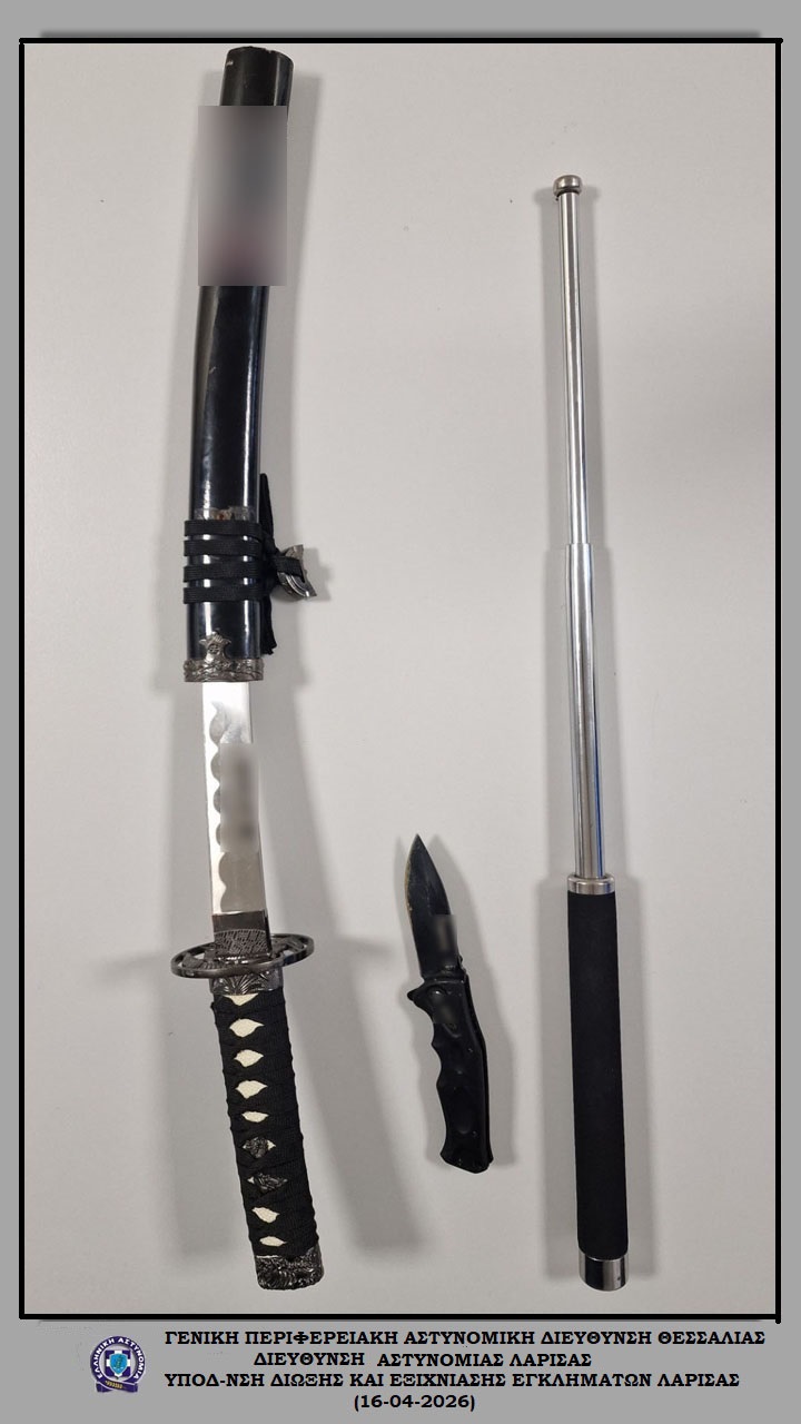 Κατά τη διάρκεια των νομότυπων ερευνών που πραγματοποιήθηκαν στις 15 Απριλίου 2026, οι αστυνομικοί βρέθηκαν μπροστά σε επικίνδυνα ευρήματα. Σε μία από τις οικίες εντοπίστηκαν και κατασχέθηκαν ένα σπαθί τύπου σαμουράι, μια πτυσσόμενη μεταλλική ράβδος και ένας αναδιπλούμενος σουγιάς.