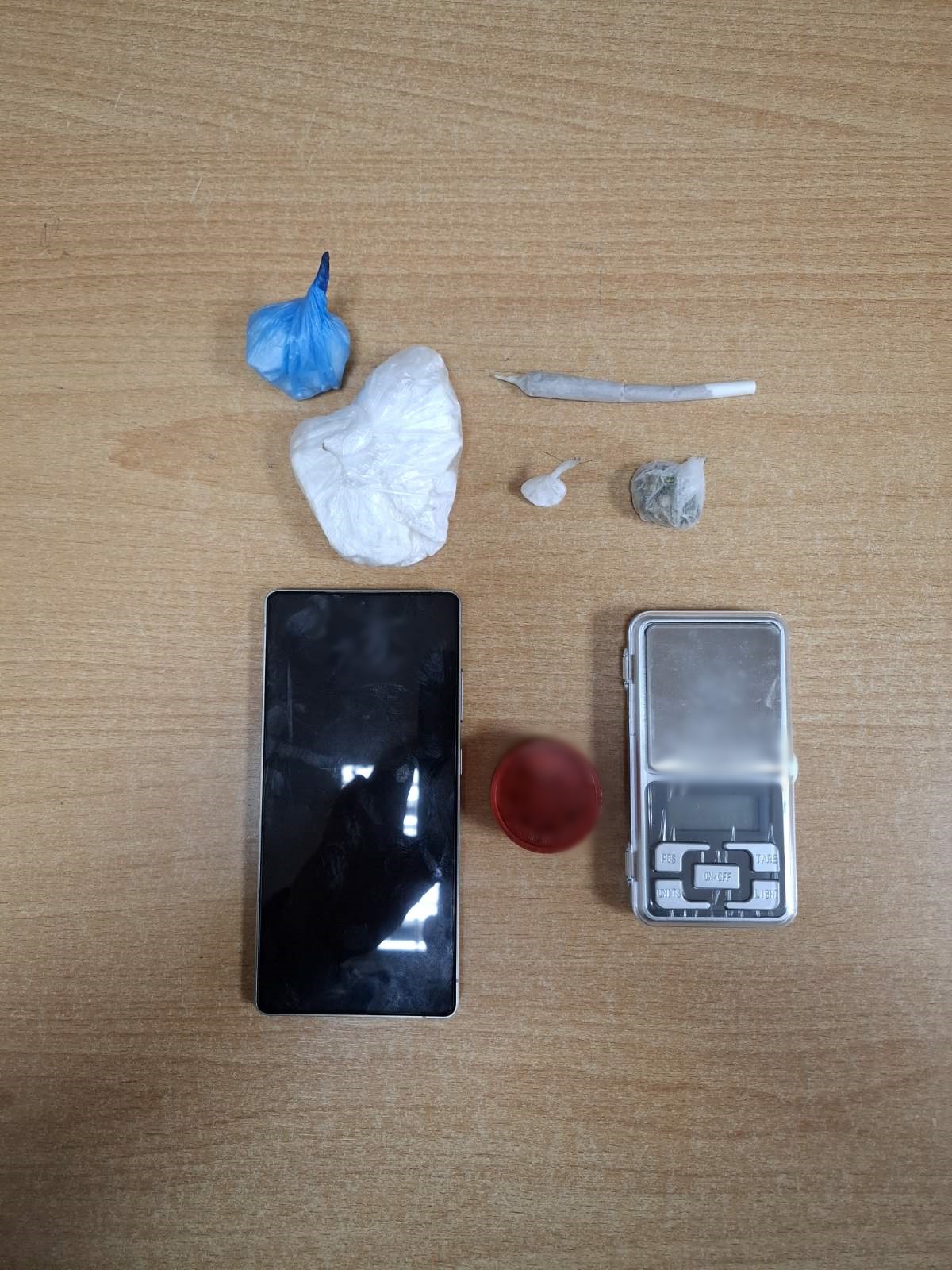 Ειδικότερα, οι αρχές κατέσχεσαν 62,3 γραμμάρια κοκαΐνης, τα οποία ήταν μοιρασμένα σε τρεις αυτοσχέδιες συσκευασίες. Επιπλέον, βρέθηκε μικροποσότητα ακατέργαστης κάνναβης και ένα αυτοσχέδιο τσιγάρο κάνναβης. Τα ευρήματα περιελάμβαναν επίσης έναν πλαστικό τρίφτη κάνναβης, μια ηλεκτρονική ζυγαριά ακριβείας, που συνήθως χρησιμοποιείται για την κατάτμηση και διακίνηση ουσιών, καθώς και ένα κινητό τηλέφωνο.