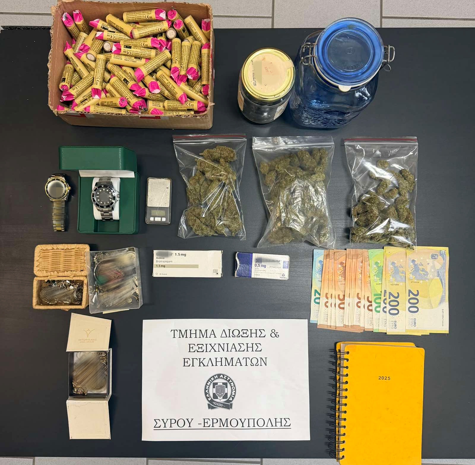 Ένας 24χρονος ημεδαπός συνελήφθη χθες, 28 Νοεμβρίου 2025, στη Σύρο από αστυνομικούς του Τμήματος Δίωξης και Εξιχνίασης Εγκλημάτων Σύρου – Ερμούπολης. Σε βάρος του σχηματίστηκε δικογραφία κακουργηματικού χαρακτήρα για διακίνηση ναρκωτικών ουσιών, κατοχή ειδών πυροτεχνίας, απείθεια και βία κατά υπαλλήλων, ενώ κατασχέθηκαν 120 γραμμάρια κάνναβης, 45 ναρκωτικά δισκία και 1.470 ευρώ.