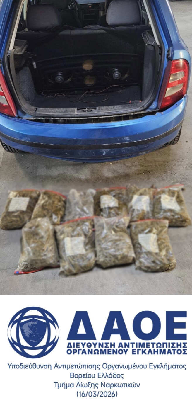 Στη σύλληψη ενός 45χρονου ημεδαπού προχώρησε η Υποδιεύθυνση Αντιμετώπισης Οργανωμένου Εγκλήματος Βορείου Ελλάδος το βράδυ της Κυριακής, 15 Μαρτίου 2026. Ο κατηγορούμενος εντοπίστηκε στην Εθνική Οδό κοντά στη Θεσσαλονίκη να μεταφέρει 5 κιλά ακατέργαστης κάνναβης επιμελώς κρυμμένα στον οπίσθιο προφυλακτήρα του οχήματός του.