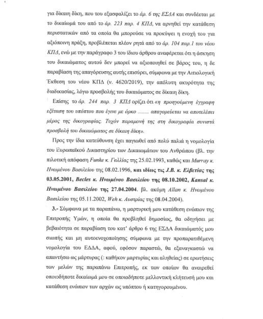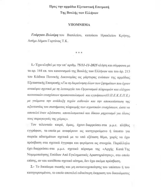 1.- Έχω κληθεί με την υπ’ αριθμ. 75/11-11-2025 κλήση και σύμφωνα με τα αρ. 144 επ. του κανονισμού της Βουλής των Ελλήνων και του άρ. 213 του Κώδικα Ποινικής Δικονομίας ως μάρτυρας ενώπιον της αρμόδιας Εξεταστικής Επιτροπής «Για τη διερεύνηση όλων των ζητημάτωνπου έχουν ανακύψει σχετικά με τη λειτουργία του Οργανισμού πληρωμών και ελέγχου κοινοτικών ενισχύσεων προσανατολισμού και εγγυήσεων(Ο.