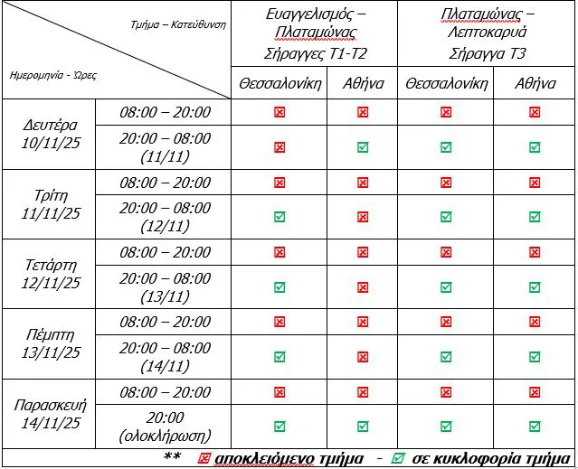 Επιπλέον, για την Παρασκευή 14 Νοεμβρίου 2025 είναι προγραμματισμένη άσκηση ευρείας κλίμακας στη Σήραγγα Τ3 με τη συμμετοχή των υπηρεσιών έκτακτης ανάγκης, πράγμα που συνεπάγεται ειδικούς αποκλεισμούς και ρυθμίσεις την ημέρα αυτή, σύμφωνα με τις σχετικές εντολές και τα σχέδια άσκησης που εμπλέκουν Υπηρεσίες Έκτακτης Ανάγκης και τεχνικά συνεργεία.