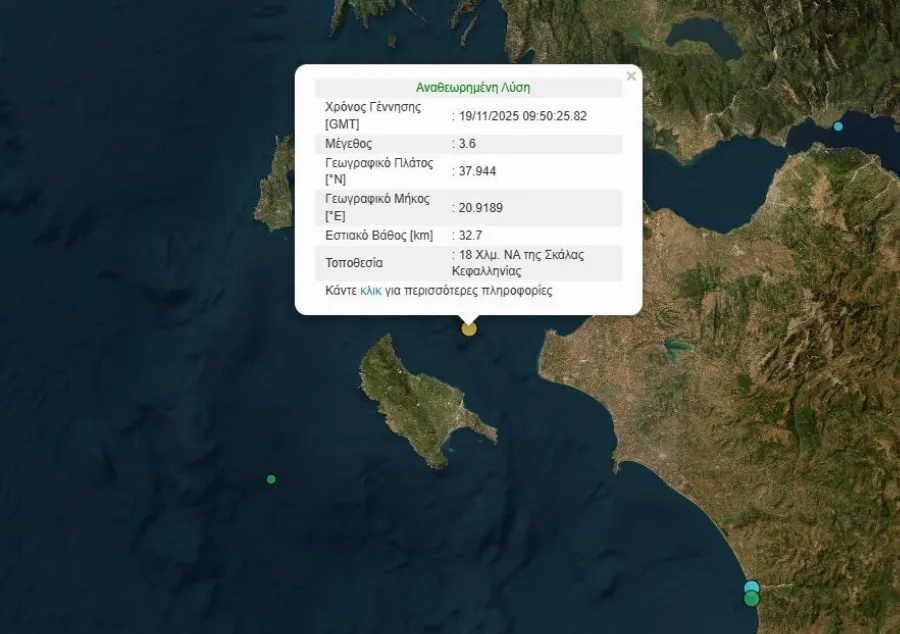 Σεισμός σημειώθηκε το πρωί της Τετάρτης (19/11) στον θαλάσσιο χώρο ανοιχτά της Κεφαλονιάς