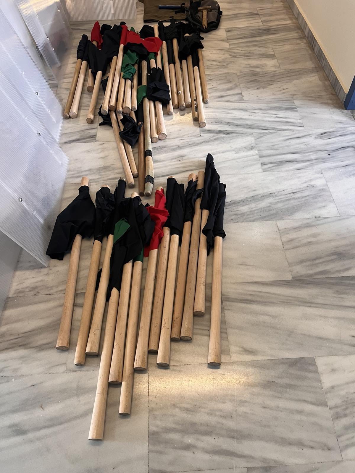 Από τις έρευνες και τους ελέγχους κατασχέθηκαν πλήθος αντικειμένων, μεταξύ των οποίων ρόπαλα και κοντάρια, αυτοσχέδιες πλαστικές ασπίδες, καθώς και αντικείμενα προστασίας και επικοινωνίας. Η λεπτομερής λίστα περιλαμβάνει 38 ρόπαλα/ξύλινα κοντάρια και 9 πλαστικές ασπίδες.