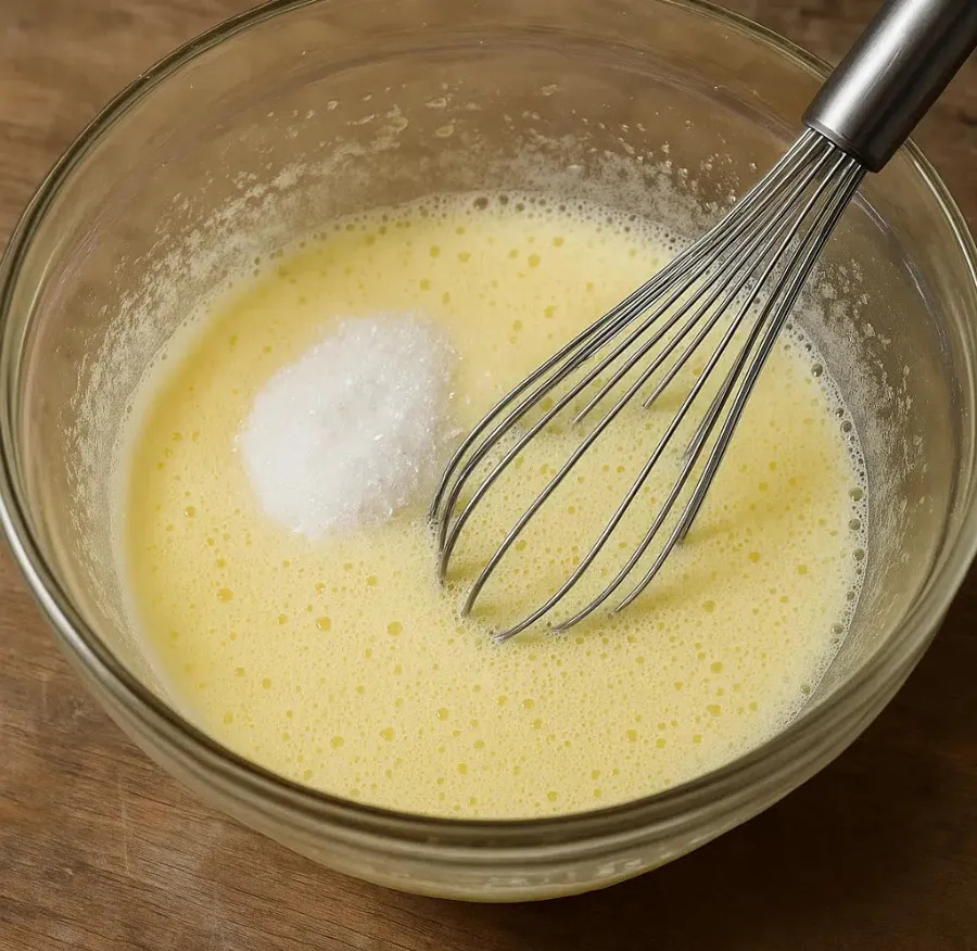 Ρίχνουμε σιγά-σιγά το μείγμα των αυγών μέσα στο ζεστό γάλα, ανακατεύοντας συνεχώς με σύρμα για να μην κολλήσει.