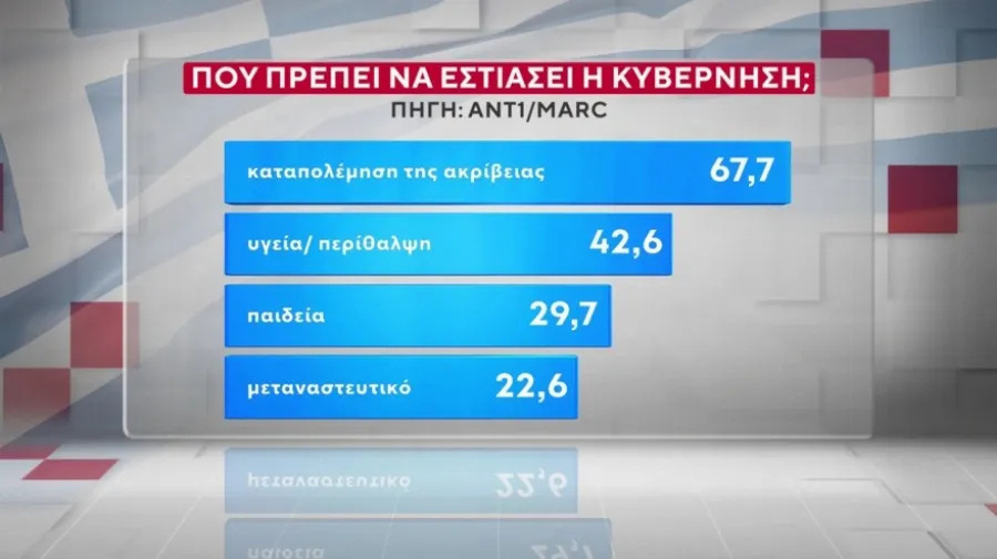Οι ερωτηθέντες στη δημοσκόπηση της Marc για τον Ant1 απάντησαν ότι η ακρίβεια και το βιοτικό επίπεδο βρίσκονται στην κορυφή με 37,7%